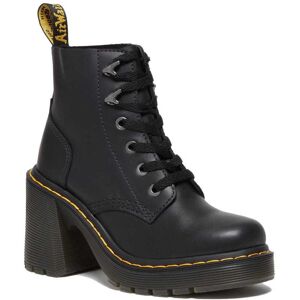The Jesy. A maximum impact 6-eye boot. Constructed from smooth, full-grain Sendal leather on our towering 3 3/4 inch Arden flared heel. Completed with an external heel counter, arrow-shaped ski hooks, gunmetal eyelets and an unmistakable yellow Goodyear welt-stitch. Signed with our scripted heel loop.Features:- Sendal is a semi-aniline, natural-looking nappa leather with a smooth full-grain finish- Standard last recommended for all feet, but perfect for average to wide width feetSpecifications:Sole Height- Platform height: 1 1/8 in- Heel height: 3 3/4 in- Material: This semi-Aniline, natural-look Nappa Leather features a smooth full-grain finish.Care Instructions:- Wipe away dirt using a damp cloth.- Apply a neutral or correct colored wax based shoe polish.- Buff with a Dr. Martens Shoe Brush to restore shine as desired.Construction:- Goodyear Welted the upper and sole are heat-sealed and sewn together, providing more comfort and durability for years to come.- Made with our Goodyear-welted lines that are heat-sealed at 700˚C and reinforced with our signature welt stitch.