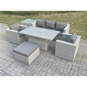 GENERAL DESCRIPTION This outdoor furniture set includes a three-seater sofa, an adjustable table, two chairs, and two stools. The set features light grey mixed rattan and dark grey fabric. The table can be used for both coffee and dining purposes. It is designed for low maintenance and comfort, with removable cushion covers and soft back cushions. TECHNICAL SPECIFICATIONS Three Seater Sofa: 177W x 65D x 66H cm Adjustable Table: 140L x 80W x 68/48H cm Chairs: 74L x 65W x 66H cm Stools: 40L x 40W x 34H cm Material: Flat PE Rattan, 5mm Tempered Glass Seat Cushion Thickness: 8 cm Frame: Sturdy Galvanized Steel Tube with Powder Coating INSTALLATION The items come flat packed and are easy to assemble. OTHER INFORMATION Keep the cushions indoors or covered when not in use. Protect the furniture with a rain cover if not used for an extended period. Check the product for damage upon delivery.