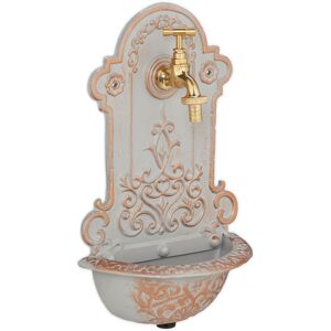 With its nostalgic design, this ornate wall fountain adds a decorative touch to your patio or garden. Whether you need to wash dirty hands, clean garden tools, or fill a watering can, this garden fountain serves as a practical and versatile water source. The outdoor washbasin features a tap and a rear connection for plumbing. Crafted from coated cast iron, the wall-mounted basin is ideal for outdoor use. Wall Fountain in Detail - Dimensions H x W x D: approx. 36 x 22 x 10.5 cm - Inner basin dimensions H x W x D: approx. 8.5 x 17 x 7 cm - Water inlet thread diameter: approx. 2.1 cm - Tap thread diameter: approx. 2.6 cm - Weight: approx. 2.8 kg - Material: Cast iron, brass - Colour: Grey, gold Garden Washbasin for the Wall - Decorative washbasin with floral pattern for outdoor use - Vintage-style fountain featuring a golden tap - Charming decoration and practical water source in one - Ideal for washing hands, filling watering cans, etc. - Made from durable cast iron for long-lasting use