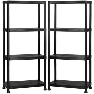 2x 4 Tier Black Plastic Heavy Duty Shelving Racking Storage Unit The black plastic racking is easy to assemble with no nuts or bolts and can be put up and taken down in seconds. The racking is made from robust, heavy duty plastic which is non-rusting and easy to clean. The shelves are able to carry an impressive 20kg UDL each. The racking can also be assembled into different types of shelf as well as a 4 tier unit: 4 singles shelves, 2 double shelves or a triple shelf and single shelf. Product Specifications Length: 60cm Width: 30cm Height: 130cm Max. Shelf Load: 20kg Max. Total Load: 80kg
