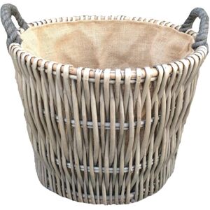 Full antique wash willow log basket with a hessian lining. Attractive looking . High Quality, Well made Basketware. Natural product so dimensions can vary slightly. Manufactured from sustainable materials. Colours and finish could vary. Size Depth 56 x Height 50 x Width 50cm Weight 5kg Material Wicker Red Hamper Wicker Round Grey Hessian Lined Log Basket in Brown