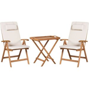 2 Seater Balcony Set. Sit comfortably and enjoy your morning coffee on the balcony with this practical bistro set. Made from high-quality acacia wood, it makes a perfect match with virtually any setting thanks to the natural, light finish. The chairs and the table can be folded for easy storage when out of season. Besides that, the set is also equipped with thickly padded cushions for the chairs. The high quality fabric is easy to care for, while the seams are carefully finished and are almost invisible. Thanks to the UV and water-resistant material used, the pillows are sure to last for many years, with the colour staying rich and adding style to your outdoor space. Details: Product Type: Bistro Set Style: Modern General Color: Brown, Beige Shade: Light Brown Material Type: Wood Main Material: Acacia Wood Additional Material: Fabric Top Material: Wood Material Composition: 100% Polyester Finish: Oiled Seats Up To: 2 People Dimensions: Chair Dimensions: 54x69x105 cm Coffee Table