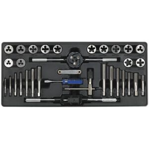 Sealey Premier Tap & Die Set with Tool Tray 33pc Features: Tool Tray with Tap and Die Set. Suitable for selected Superline PRO® and Premier Tool Chests. Technical Details: • Contents: Taps and Dies; 3 x 0.5, 4 x 0.7, 5 x 0.8, 6 x 1, 8 x 1.25, 10 x 1.5, 12 x 1.75mm, 1/4"-28, 5/16"-24, 3/8"-24, 7/16"-20, 1/2"-20UNF, 1/8"-28, 1/4"-19BSP. Tap Wrench, T-Bar Tap Wrench, Die Holder, Thread Gauge, Screwdriver • Tray Size (W x D x H): 176.5 x 397 x 55mm. • Model No. TBT26 • Model No. TBT26 Additional Information: • Comprehensive and exciting range of Premier Line tool trays. • Designed to fit the AP24 Topchest, Rollcab and Workstation range and a selection from our Superline PRO® range, these trays are available in over 30 different configurations. • The tools have been carefully selected for the professional technician from our Premier Line range. • Design your own tool kit by purchasing the trays separately, or take advantage of our specially selected combination deals. • Contents: Taps and