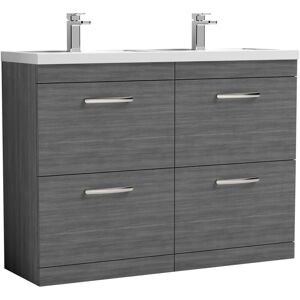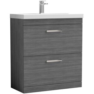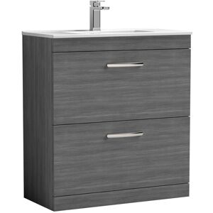 Model Number: ATH067D Introducing the Nuie Athena Anthracite Woodgrain 800mm Wall Hung 2 Drawer Vanity Unit and Thin Edge Ceramic Basin, a stunning addition to any modern bathroom. This stylish vanity unit combines practicality with contemporary design, featuring a beautiful woodgrain finish that adds warmth and elegance to your space. The anthracite colour provides a chic touch, ensuring it complements a variety of interior styles while enhancing the overall aesthetic of your bathroom. This unit is crafted from high-quality MDF, ensuring durability and longevity. The two spacious drawers offer ample storage for your bathroom essentials, keeping your space tidy and organised. Designed with a soft-close mechanism, these drawers provide a quiet and smooth operation, preventing any accidental slamming. The accompanying 390mm slim edge ceramic basin is not only visually appealing but also features a single tap hole, allowing for the installation of a stylish mono basin mixer tap. Key