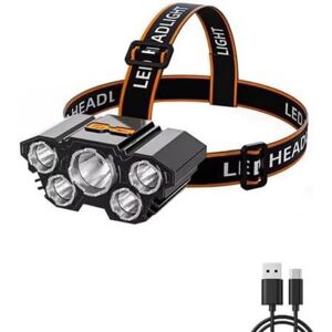 POWERFUL LIGHTING: Equipped with 5 ultra-bright LEDs providing optimal lighting for all your nighttime activities, whether outdoors or indoors USB RECHARGEABLE: 800mAh built-in battery, rechargeable via the included USB cable, allowing for extended and economical use COMFORT OF USE: Adjustable elastic headband with orange reflective strips for better visibility and a comfortable fit MULTIPLE MODES: Multiple lighting modes available to suit your needs, from bright to soft light PRACTICAL DESIGN: Sturdy and lightweight construction, 90-degree rotatable, ideal for camping, hiking, DIY, and maintenance work