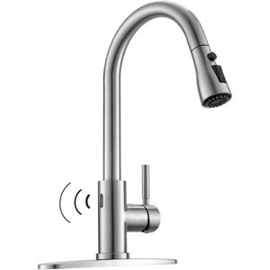 Touchless Kitchen Faucet: Turn on the sink faucet switch and wave your hand to activate the water (on/off) for precise and convenient use. Automatically stops water supply after 3 minutes of inactivity to avoid waste. 3 Nozzle Modes - Stream for filling, Spray for rinsing, Pause to avoid splashing. The brushed nickel kitchen faucet features a 24-inch extended pull-down hose and the 360° high-arc swivel spout provides a full range of cleaning angles to meet your cleaning needs in every corner. SAFE AND RELIABLE QUALITY - Food grade SUS304 stainless steel ensures water quality and your health. Excellent corrosion-resistant and anti-rust surface treatment prevents dirt from sticking to the surface, and daily cleaning only requires a rag. With a kitchen faucet, life just got a lot easier. EASY INSTALLATION - Your modern kitchen sink faucet comes with a pre-installed pull-out hose and float hose, DIY installation in less than 30 minutes. Save time and money by eliminating the need for a