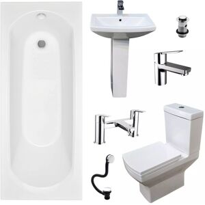 Complete Bathroom Suite Imelda Bath Gillian White Modern Style Inc Haze Taps Complete bathroom suite, including a Imelda 1675 x 700mm bath, with anti slip surface, Gillian Rimless toilet & Basin Set, and including Francis Pegler Haze bath taps pair with single lever basin mono mixer and click clack wastes. Imelda 1675mm x 700mm acrylic bath With anti slip surface on bottom of bath Manufactured from Lucite acrylic sheet as used by the world’s leading bathroom manufacturers Fibre glass reinforced Un-drilled for tap holes, can easily be drilled on site Bath complete with legs & adjustable feet CE approved Bath panels NOT included Bath sizes approx: External Length: 1675mm External Width: 695mm External Height: 555mm Internal Length near top: 1480mm Internal length near bottom: 1140mm Internal width near top: 520mm Internal width near bottom: 400mm Inside height max: 370mm Inside from bottom of bath to centre of overflow: 310mm Gillian Rimless Basin & Toilet Set Gillian rimless close