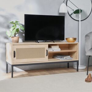Bohemian elegance, industrial impact. VonHaus Rattan TV Unit for TVs up to 55" Bohemian textures, Scandi tones, and industrial accents: introduce style into your hallway with the VonHaus TV stand cabinet. Crafted from light wood effect MDF, the rattan-fronted door keeps contents contained in rustic style, whilst the black metal frame and handles add a bold finishing touch. Keep your spare bits and bobs out of sight whilst presenting a sleek aesthetic with this TV table, marrying form and function. Keep bulky blankets in the larger compartment, with smaller media accessories and consoles on the two shelves. Or why not use the open shelving for decorations? Simply adjust the sliding door to display each compartment. Position your TV (max 55”) on the top surface and relax in style. Browse the Lena range today to weave that boho touch throughout your home. VonHaus