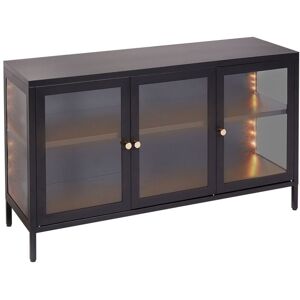 Backlit Cabinet with Glass Front. This elegant sideboard is a great storage solution for any hallway, living room, and home office. LED stripe included in the purchase will perfectly illuminate the piece. Sturdy steel construction makes the piece stable and long-lasting. Capacious compartments behind tempered glass doors provide ample storage space, perfect for books, dishes, and decorative elements. Details: Product Type: Display Cabinet Style: Industrial General Color: Black LED Colour Temperature: Warm White Material Type: Metal Main Material: Steel Additional Material: Tempered Glass Legs material: Metal Doors Opening: Standard Drawers: No Finish: Powder Coated IP Protection Code: IP 20 LED Luminous flux: 200 LED Type: SMD 5050 LED: Yes Number of Doors: 3 Shelves: Yes Voltage rating: 12 V Dimensions: Depth: 35 cm Width: 115 cm Height: 65 cm Weight: 22 kg Shelf Weight Capacity: 30 kg Top Weight Capacity: 30 kg Offer Includes: 1 x Display Cabinet, 1 x LED Stripe 5 m Key Features: