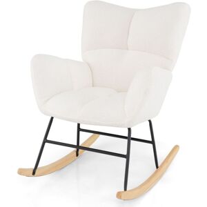 Experience the perfect combination of comfort and tranquility! Wrapped in premium teddy fleece fabric, this stylish upholstered rocking chair soothes the skin, allowing you to sit back, relax, and feel the plush comfort. Designed with ergonomics in mind, a high backrest and padded armrests support and ease your body through those sleepless nights. Featuring a hypnotic, gentle rocking motion, it lulls your little darling to sleep while keeping you relaxed. Made of natural rubber wood base and solid metal frame ensuring safety and lasting use, this nursery chair is the sanctuary youve been dreaming of for your nursery! Click to assemble effortlessly and rock your way to bliss. Dont wait, create your perfect parenting haven now!