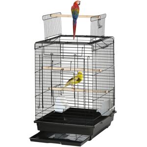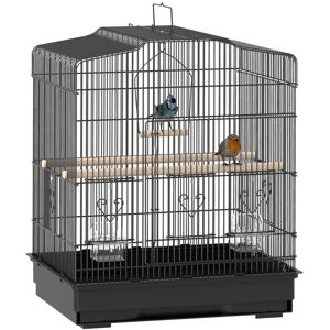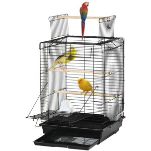 A spacious PawHut bird cage, featuring two wooden perches, two plastic food containers and a swing to provide an entertaining and comfortable home for birds. Its large front door allows easy access, while the five small doors enable feeding, cleaning and interaction. The slide-out tray at the bottom makes it easy to clean, keeping the space tidy and comfortable for eating, playing and relaxing. Specifications: ● Material: Metal wire, wood and PS ● Colour: Black ● Overall dimensions: 59H x 46.5L x 36Wcm ● Bottom tray: 10H x 46.5L x 36Wcm ● Large door: 31L x 31.5Wcm ● Small door: 8.5L x 11.5Wcm ● Food bowl: 9H x 8L x 6Wcm ● Perch: Φ1.5 x 47Lcm ● Swing: 16H x 15Wcm ● Bar spacing: 1cm ● Net weight: 3.5kg ● Item label: D10-018V03BK Features: ● Spacious design, made from powder-coated metal for stability ● Inside features two perches and two food bowls ● A large front door for easy access ● Multiple sliding doors included ● Slide-out tray for effortless cleaning ● Assembly required