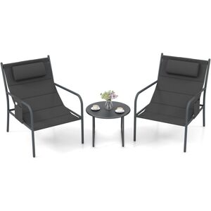 Experience ultimate comfort with this 3-piece ergonomic bistro chair and table set. Each chair features contoured sling seat with padded sponge layer and breathable fabric, complemented by an elastic headrest for enhanced comfort. The sturdy metal frame supports up to 330 lbs per chair, while the matching coffee table can hold up to 110 lbs. Complete with a side storage pocket, the chairs will make you relax with more convenience. With elegant appearance and high-level comfort, this set is ideal for your patio, backyard or poolside. Enjoy relaxing outdoors with this stylish and comfortable furniture set.