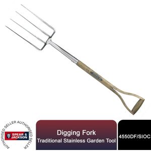Spear & Jackson Digging Fork, Traditional Stainless Garden Tool This Spear and Jackson traditional digging fork is the ideal addition to the garden. The handle is constructed from hardwood. The wooden shaft is one piece, split to form a comfortable wishbone handle, giving a smooth line from bottom to top. This look is achieved whilst maintaining a weatherproofed finish, so you are safe to use it in all weathers. The head itself is constructed from mirror polished stainless steel. This makes it rust-resistant and keeps soil adhesion to a minimum. The head itself is constructed from mirror polished stainless steel. This means that it is both resistant to rust as well as keeps soil adhesion to a minimum. The Traditional stainless range of digging and cultivating tools has been created by combining modern and natural materials with the latest technology to create a timeless classic. Features: Ideal for heavy digging and breaking up soil Mirror polished stainless steel head for rust