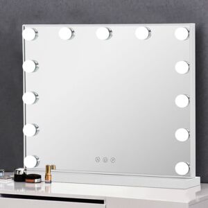 Description Get ready for your close-up with the Hollywood Makeup Vanity Mirror by Livingandhome. This slim-framed mirror features 15 adjustable LED bulbs in three colour modes, providing perfect lighting for all your makeup needs. The bulbs are replaceable, ensuring a longer lifespan than other non-replaceable makeup mirrors. The convenient plug-in feature ensures that the mirror will never run out of power, allowing you to focus on looking your best without worrying about battery life. Features *15 brightness adjustable LED bulbs in three colour modes *Slim mirror frame with rounded edges for a stylish look *Non-detachable sturdy metal base for reliable stability Specifications Dimension: 50*40cm Mount Type: Freestanding Shape: Rectangle Framed: Yes Frame Material: Metal Colour: White Power Source: Plug-in Plug Included: Yes Lighting Included: Yes Bulbs Included: Yes Number of Bulbs: 15 Dimmable Lighting: Yes Package Content 1 x LED Makeup Mirror 1 x Plug