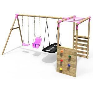 Our gorgeous Rebo wooden swing sets are the perfect addition to your garden and with the added deck and slide these swings sets are going to provide hours of fun for children of all ages. Constructed of pressure treated timber they are built to last. Over engineered 90mm top beam ensures maximum strength combine with 70mm legs ensures your children stay safe at all times. The added deck is designed to fit to the side of the swing set and will add an extra dimension to the fun thanks to the 6ft injection moulded slide. For stability play equipment must be anchors, various options available depending on the ground type, searching Rebo anchors on the store will show you the options Rebo Wooden Triple Swing Set with Baby Seat, Boat Swing & Slide - Halley Pink