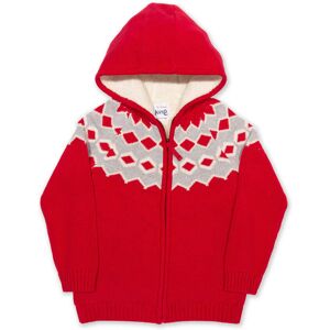 Outer: 100% organic cotton Lining: 100% polyester Red with jacquard design at yoke Chunky knitwear Fleece lined Zip through with red herringbone tape zipper pull Long sleeved Lined fleece hood Ribbed cuffs and hem Made in India Machine washable at 40 degrees, or at 30 degrees to be kinder to the planet