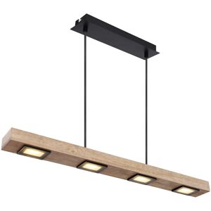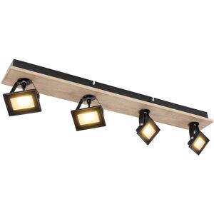 This ceiling spotlight from the Joya series impresses with its beautiful design made of black-matt metal and wood. The four swiveling spotlights are provided with satin-finished glass and mounted on the wooden top (66x8 cm) by means of brackets. Due to the included LED bulbs, the ceiling spotlight provides 1680 lumens of strong light with a pleasant light color of 3000 Kelvin (warm white). With more articles of the Joya series you can complete the overall picture of your interiors. Product features: Spotlights metal black matt, wood dark brown, glass satined, clear, lxwxh: 660x80x110mm, incl. 4x led 5w 230v, 500lm source, 420lm output, 3000k