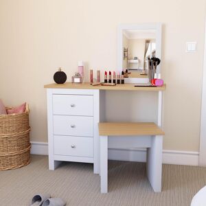 This dressing table set features 3 large storage drawers, ideal for storing your make-up, brushed, and jewelry. Alternatively, the drawers can be used as part of a workstation to store your supplies such as paper, pens, and other stationery. Also features a rectangular mirror and a matching stool to complete the set. The chic combination of the mid-tone with the contrasting oak effect table top will transform any bedroom from a traditional setting to a modern one. Please note that this item is delivered flat-packed for home self-assembly. Fernleaf Colour: Grey