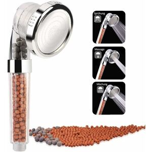 【High pressure and water saving】 The special shape of the water nozzles increases the pressure, the water pressure increases up to 50%. Laser perforated micro-nozzle technology saves up to 50% water. The water comes out much softer, very pleasant on the skin. Works with increasing water pressure. 【3 Spray Modes Showerhead has 3 spray modes: rain, massage and jet. You can easily switch between 3 modes by pressing the rocker button on the hand shower head. Each mode brings you a special shower experience. 【Anti Limestone Hand Shower】 Infrared mineral stone and negative ion mineral stones form a double filter system which contributes to the reduction of chlorine and the absorption of pollutants in air, removes impurities in the water and bacteria cleans and softens the shower water and softens the skin and hair and makes them smoother. 【Universal fitting】 Shower head fits universally to most standard shower arms. Simply screw on, easy assembly without tools. It is from ABS material,
