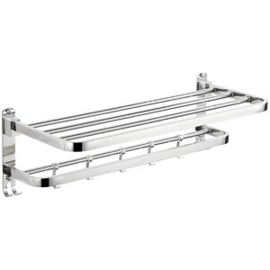 【Two Installation Methods】1. Punching installation, this installation method is more solid. 2. Adhesive installation. This type of installation is more convenient and quick, and ensures the integrity of your wall. You can choose your own installation method. Maximum load capacity: 20 kg. 【90°Adjustable Towel Rack】When you don't need to store too many towels, the towel rack can be rotated 90° against the wall. The bathroom towel rack provides you with plenty of space. The polished silver design brings a modern and elegant look to the bathroom. The smooth rounded corners of the folding towel rack are designed to not hurt your hands and prevent towels from slipping. 【Effectively Organize Space】The double-layer design can bring you a dual-use experience of wet and dry separation. The upper tier of the towel rack can hold bath towels, washcloths, clothes, etc., while the lower tier can hold wet towels. In addition, the two-tier towel rack is equipped with 5 movable hooks for hanging small