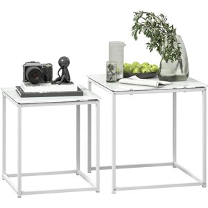 Style made simple with these two nesting tables from HOMCOM. Square in shape, they're an easy way to display your favourite pieces in the home of office - letting them stand out and shine. The frame, made from steel for a strong core, is fitted with a tempered glass table top; safely tough so it doesn't break, also gives both tables a sleek and polished look. Set consists of a smaller and larger tables, so when not in use, can be snuggly fitted together, keeping your house tidy. HOMCOM Nest of 2 Side Tables Set of Bedside Tables for Living Room White