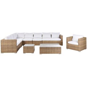 Wicker Sofa Set. Turn your backyard into a comfortable lounge with this stylish garden set. All modular pieces are easily movable for the desired arrangement. The rustproof aluminium frames are covered with durable synthetic rattan, and low seating, back-supporting cushions add extra comfort. The modern design with sleek lines and an attractive colour scheme provides a luxury feel. An ultimate garden set with ample seating for everyone to enjoy your outdoor living space. Details: Product Type: Lounge Set Style: Scandinavian General Color: Brown, White Shade: Off-White Material Type: PE Rattan Main Material: PE Rattan Additional Material: Tempered Glass Material Composition: 100% Polyester Shape: L-Shaped Finish: Gloss Orientation: Right Hand Seat Foam Density: 24 kg/m3 Seats Up To: 8 People Dimensions: 2 Seater Sofa Dimensions: 110x76x65 Armchair Dimensions: 80x76x65 Chair Dimensions: 60x76x65 cm Coffee Table Dimensions: 100x70x35 Seat Thickness: 10 cm Seat Height: 31 cm Side Table