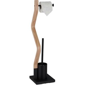 With this stylish toilet butler, you always have toilet paper and a toilet brush at hand. Whether in the bathroom or guest toilet, the free-standing WC set can be placed flexibly and does not have to be attached to the wall. The modern design of the toilet stand made of white metal and the look of natural wood is a great eye-catcher in the bathroom. The replaceable brush head and the removable plastic brush container ensure the necessary hygiene. WC set in detail - Size H x W x D: approx. 75 x 18.5 x 18.5 cm - Weight: approx. 2.1 kg - Material: Steel, MDF, plastic - Colour: White, natural Detailed dimensions of the toilet set - Toilet brush holder H x D: approx. 13.5 x 9.5 cm - Toilet Brush L: approx. 36 cm - Brush head H x D: approx. 10 x 8 cm - Internal thread D: approx. 9 mm - Width toilet roll holder: approx. 15 cm Standing toilet roll holder - Practical combination of paper and brush holder - Hygienic - brush head easily replaceable - Stable stand thanks to rectangular base plate