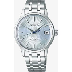 The Seiko Presage blends timeless design with precise Japanese mechanical craftsmanship, featuring minimalist style and refined aesthetics. Inspired by Japanese cocktail culture, the light blue dial takes cues from the Sky Diving cocktail served at Tokyo’s Ginza Skybar. Created in stainless steel, this attractive timepiece is complete with a stainless steel bracelet with a pushbutton clasp for a secure fit, and a date window for added functionality. • Powered by the 4R35 automatic movement with 23 jewels and a power reserve of up to 41 hours. • Presented on a silver stainless steel bracelet with push button deployment clasp. • Box shaped hardlex crystal glass. • 33.8m case width. • 50 metre water resistance.