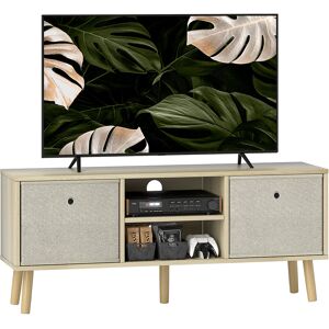 A new take on a TV unit or simple home storage - the choice is yours with HOMCOM unit. There are two shelves and two drawers - offering large amounts of space to keep the home tidy. Table top is large enough for a 50" TV or screen. Five wooden legs keeps it balanced and supported. And to double your storage? You can easily take out the fabric drawers.Features:Two removable drawers and two shelves for storage. Flat table top suitable for TV and monitorsFabric drawers easy to maintainCan be taken out too for extra and freestanding storageCable holes on back to group together safelyFive wooden legs for support, angled for balanceAssembly required