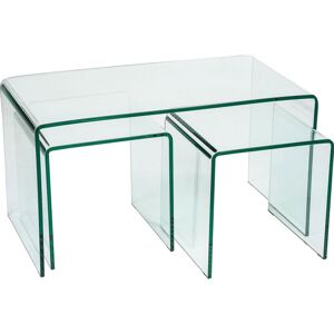 MODENA SET OF 3 CURVED BLACK GLASS COFFEE TABLES GLASS LIVING ROOM TABLE MODERN ITALIAN SOPHISTICATION - A sleek European designer glass table set, made from single sheets of black translucent glass using a process pioneered in Italy during the 1930s. The contemporary Modena curved all glass coffee table set consists of 1 large glass coffee table and 2 small side tables that nest perfectly underneath. A stylish minimalist statement piece sure to be the focal point of any living room setting. PERFECTLY PROPORTIONED - Designed to be a functional focal point of the living room, the large coffee table for living room measures 86 x 46 cm whilst the 2 small glass occasional tables each measure 38 x 38 cm. The side tables can be used independently of each other and when not in use fit neatly under the main big coffee table for a clutter free look. Each modern coffee table provides the perfect perch for snacks and drinks, or to display a stylish coffee table book or magazine. PREMIUM