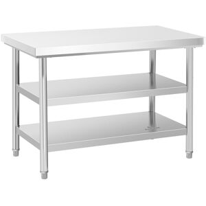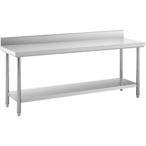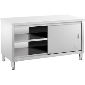 Whether in a restaurant, canteen, hotel, bakery, hospital or large kitchen: Stainless steel furniture is the basis for a clean kitchen and the hygienic handling of all kinds of food. The cabinet RCSSCB-150x70-E from Royal Catering, the experts in high-quality catering equipment, belongs in every professionally equipped kitchen and was specially designed for designed to meet high requirements in the catering industry. The 150 x 70 cm large work surface of the modern stainless steel cabinet offers plenty of space for your daily work with fresh food, ingredients and kitchen appliances. The ingenious combination of work surface and storage cabinet enables a wide range of uses and ensures that your kitchen is permanently tidy. Equipped with two practical and space-saving sliding doors, the work cabinet is particularly recommended in narrow kitchens. The utensils stored inside remain safely and neatly stowed behind the easy-to-use sliding doors. The interior is divided by a sturdy shelf, which ensures a clear arrangement. Like the lower shelf and the work surface, it can be loaded with up to 200kg . This results in an extremely high total load-bearing capacity of the catering work cabinet of a maximum of 600kg. The stainless steel work table achieves optimum stability even on uneven floors with the help of the 2 cm height-adjustable feet.The 10 cm high upstand closes the gap between the work surface and the wall. This prevents the wall from being soiled by splashes or other dirt or from falling something between the cabinet and the wall. The kitchen work table is made of polished stainless steel and impresses with its high resistance, long service life and is resistant to corrosion and mechanical damage (e.g. scratches). The material can be cleaned easily and thoroughly, and thus offers perfect conditions for hygienic work with food. The assembly of the elegant work cabinet is effortless thanks to the easy-to-understand assembly instructions supplied.
