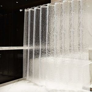 WATERPROOF: shower curtain 240 x 200 cm (LxH), prevents water splashing, warm and moisturizing. Using the bath curtain in winter can maintain the temperature of the bathroom to prevent dissipation rapid heat. Note: Do not wash in the washing machine, wipe it with a soft damp cloth. Safe material: The eva shower curtain is waterproof, mildew resistant, durable and easy to clean with a damp cloth. The curtains have anti-mildew and antibacterial effect, which effectively prevents mold and bacteria from growing, spreading and damaging your health PATTERN: Transparent 3D water cube, curtain Uniquely designed 3D water cube shower head creating a blur effect COPPER SHOWER CURTAIN HOOKS: multi-layer chrome plating, rust-proof, durable, greatly improve the life of the shower curtain FOLDABLE: The size of the excess shower curtain is 240 x 200 cm, long enough for the bathtub. Save space, easy to use. Hand or machine washing of the bath curtain is not essential. The PEVA shower curtain should be