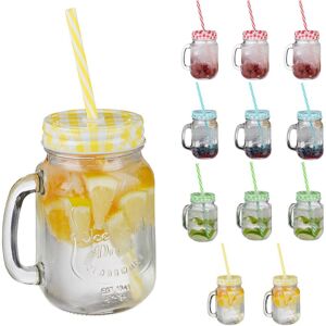 This set of 12 drinking glasses is ideal for enjoying refreshing cold drinks such as juices, lemonades or iced tea and cocktails. With their decorative Ball Mason Jar design, the summer glasses will be an eye-catcher in your home bar or at the next garden party. Thanks to the straws, the drinks are quickly emptied, while the practical screw lid protects the contents from dirt or insects. Enjoy the summer with your friends to the fullest with these trendy soda glasses. Drinking glasses set of 12 in detail - Dimensions with lid H x W x D: approx. 13.5 x 11 x 8 cm - Straw H x Ø: approx. 18 x 0.7 cm - Volume: approx. 500 ml - Weight per glass: approx. 300 g - Material: Glass, steel, plastic - Colour glasses: Transparent- Colours lids: Blue, green, yellow, purple Summery lemonade glasses with lid and straw - Practical set of 12 with dotted lids and straws - Suitable for iced tea, smoothies, juice, cocktails and much more- Handle glasses are ideal for children's birthday parties and garden