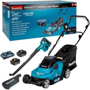 Cost-competitive 380mm cordless lawn mower powered by two 18V Li-ion batteries in series. Recommended for lawns up to 560m2 . The Makita DLM382PT2 is powered by two 5.0ah 18v Li-ion batteries in series to supply energy to the powerful 36V DC motor drive system. Comes with a battery capacity warning lamp. Recommended for lawns up to 560m2 Electric brake Powered by two 18V Li-ion batteries in series to supply energy to the powerful 36V DC motor drive system. Single lever cutting height adjustment for quick adjustment of 13 cutting heights Grass box with grass level indicator Rubberised handle bar Low noise and vibration Includes: 2 x 5.0ah Batteries Dual Port Charger