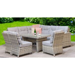 Signature Weave Amy is a large corner dining sofa with 3 single armless chairs and pale grey cushions High strength powder-coated aluminium frame UV treated wicker Care Instructions: Cushion covers are showerproof but need to be stood on their ends for water to drain away. All cushions should be stored away in a dry area when not in use. Cushion covers can be cleaned with soapy water and a damp cloth that is not abrasive. We do not advise to wash or tumble dry as this may effect the showerproof properties. Do not leave any glass items/objects on the table without mats/coasters. Do not store glass on its end during assembly; please place on a flat surface on carton provided. Cover glass in extreme heat as this can magnify the heat and melt wicker. Packaged in 4 cartons Delivery to the following postcodes are POA, please contact us before ordering - KW, IV16 and above, PA20 and above, PH30 and above. Delivery to BT, PO Isle Of Wight Postcodes & Offshore Islands is not possible