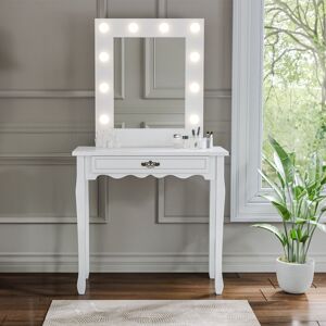 Features This dressing table set with lights will make your dream come true. Press once to illuminate your dressing area, sit before the large mirror, and you'll feel like a movie star while applying makeup The makeup mirror features 10 built-in LED bulbs, 3 color(warm white, yellow, cold white) are adjustable Enough storage room provided by 4 drawers with crystal handles; orderly storing your jewelry, hair accessories, nail polish, hair care product, and cosmetics by the division boards in drawers With smooth, easy-to-clean surface, premium MDF panels, and a clear glass mirror, this dressing table is committed to serving your beauty for ages It looks fabulous in any decorated bedroom and dressing room Specification Material: MDF 4 Drawer: Table Overall Dimension: 71(L)x40(W)x141(H)cm Stool Overall Dimension: 37(L)x28(W)x44(H)cm Package included 1 x Dressing Table 1 x Dressing Stool