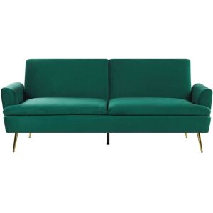 Glam Velvet 3 Seater Sofa with Golden Legs. The clean modern design of this sofa is sure to complement a living room in every style. During the day it offers comfortable chilling area for 3 people. When the evening arrives just use the easily unfolding click-clack mechanism and enjoy plenty of sleeping space. The sofa bed is thoroughly upholstered in smooth velvet fabric in a modern dark green shade. Tapered metal legs in a gold finish gives an extra glam look to the piece. Details: Product Type: Sofa Bed Style: Modern General Color: Green, Gold Shade: Dark Green Material Type: Fabric Main Material: Velvet Additional Material: Metal Filling Material: Foam Material Composition: 100% Polyester Arm Style: Flared Leg Caps/ Pads: Yes Reclining: No Removable Cushion Covers: Yes Seat Construction: Sinuous Springs Seats Up To: 3 People Sleeper Function: Yes Sofa Bed Open Mechanism: Click-Clack Storage: No Dimensions: Armrests Height: 61 cm Depth: 84 cm Seat Thickness: 11 cm Seat Height: 50 cm