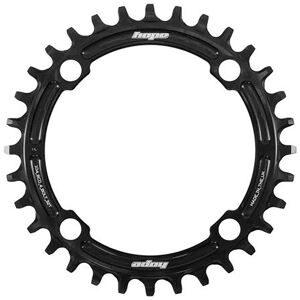 Available in 32, 34, 36 & 38T 104mm BCD 4 Bolt A new range of MTB chainrings from Hope which offer a new tooth profile compatible with all major drivetrain types along with updated spider designs. Compatible with 9/10/11 and 12Spd drivetrains including Sram T-Type and Shimano HG+ Asymmetric tooth profile engineered for cross compatibility and functionality with different drivetrain systems Improved mud shedding capability Improved chain retention Better performance with extreme chain angles on modern 1 x drivetrains Tooth profile allows for more chain wear before function is compromised, extending service life Spiderless rings have a new leg design with improved strength and stiffness Machined from 7075-T6 aluminium