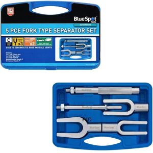Professional Tools Backed By A LIFETIME Warranty The blue spot tools 5 PCE fork type separator set is manufactured from forged carbon steel for increased durability. The set consists of 3 forked heads; 1 x 28.5mm (1-1/8"") pitman arm, 1 x 23.81mm(15/16"")ball joint, 1 x 17.4mm (11/16"")tie rod and 2 handles; one to be used with a manual hammer 200mm (8"") and another to be used with an air hammer 178mm (7""). Both handles fit all heads. Ideal for separating tie rods and ball joints on most cars and light commercial vehicles. Manufactured from forged carbon steel for increased durability 3 forked heads 2 handles that fit each head Used to separate tie rods and ball joints Can be used on most cars and light commercial vehicles PACKAGE CONTENTS1 x 28.5mm (1-1/8"") pitman arm, 1 x 17.4mm (15/16"") ball joint, 1 x 17.4mm (11/16"") tie rod, 1 x manual hammer handle 200mm (8""), 1 x air hammer handle 178mm (7"")