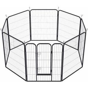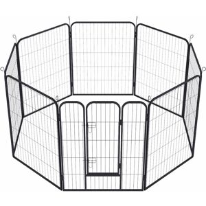 Create a haven for your pets with this versatile PawHut playpen. Consisting of eight panels to set up in different shapes, this pet pen fits any layout easily. Whether it's your living room or garden, the robust metal ensures unwavering stability, offering your companion a safe sanctuary. Setting up is a breeze – unfold, stake securely and watch them love their new-found space. Relax and enjoy some peace of mind, knowing they're happy and secure. Specifications: ● Colour: Black ● Material: Steel ● Overall dimensions: Square: 80H x 164L x 164Wcm. Single panel: 80H x 80Wcm. Door: 58H x 40Wcm. Bar spacing: 5.5cm ● Item label: D06-201V01BK Features: ● Eight steel panels quickly reshape as rectangles, squares or other shapes ● Nine ground stakes securely anchor any configuration ● Freestanding or mounted, you can use it in rooms or gardens ● Steel pipes offer strong construction ● Suitable for indoors and outdoors. When using indoors, place a pad at the bottom ● Suitable for small and