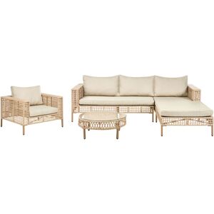 Outdoor Corner Sofa with Armchair and Coffee Table. Give your outdoor space a fresh summer look with this elegant and practical lounge set that comfortably seats 4 people, making it ideal for relaxing outside. It includes a generously sized corner sofa, a cosy armchair, and a round table. Separate elements allow flexible positioning to suit your garden, patio, or terrace layout. Made from high-quality PE rattan, the set offers many pluses, including UV resistance, protection from light rain, rust-proof frames, and an authentic appearance that looks as good as real rattan. Complete with fitted cushions, it creates a welcoming and comfortable area where you can sit down, unwind, and enjoy the weather in style. Details: Product Type: Lounge Set Style: Boho General Color: Beige Frame Colour: Beige Material Type: PE Rattan Main Material: PE Rattan Additional Material: Aluminium Top Material: Glass Material Composition: 100% Polyester Finish: Powder Coated Orientation: Left Hand Seat Foam