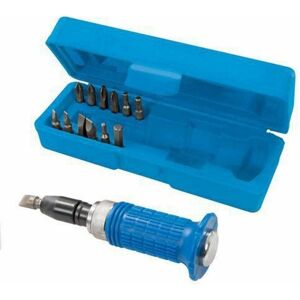 Fully reversible action (clockwise / anti-clockwise). Soft-grip handle with protective guard. 1/2" square drive attachment can be used with sockets. Includes 13 x S2 steel bits: Phillips PH1, PH2, PH3 & PH4; slotted 5, 6, 8, 10 & 12mm; hex 4, 5, 6 & 8mm. Satin finish. Storage case.