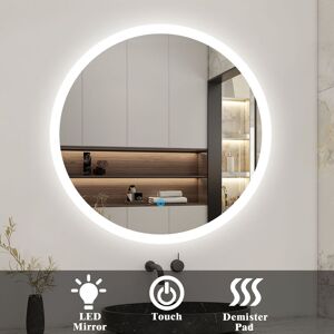 800x800 Round Bathroom Mirror with LED Lights,Anti-fog,Touch Sensor,Cool White Light,Wall Mounted,IP44-1.5cm Product Features: With Demister Pad---A big enough demister pad for a steam free reflection in the bathroom Skin Sensitive Touch System---A single button for simple on/off control the led light and demister pad together.Button Blue: led light and demister pad is ON. Button Red: led light and demister pad is OFF 6000K Cool White LED Light---6000K led light is nearly equal to a bright daylight. Its illuminating light surrounds the mirror so you will always be able to see what you're doing clearly More Durable and Safety Glass for Bathroom---There are 4 different layers including float glass, a mirror reflection layer, protection layer, and waterproof paint. which 5 times longer than normal ones in the bathroom. IP44 Standard---IP rating stands for 'ingress protection' and the numbers refer to the level of protection (from water, steam and dust). All our mirrors are IP44 rated