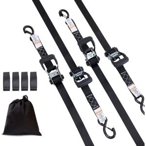 Mophorn Heavy-Duty Ratchet Tie Down Straps Reliable Strength & Double J Hooks These high-quality polyester cargo straps are reinforced with additional stitching to maintain exceptional tensile strength, even in challenging weather. The ratchet straps offer powerful load capacity and breaking strength for securely transporting cargo. Exceptional 10000 lbs Breaking Strength Strong & Secure Double J Hooks Quick and Easy Fastening Comprehensive Set with Accessories Key Features Powerful 10000 lbs Breaking Strength Crafted from high-quality materials, these ratchet straps boast a 10000 lbs breaking strength and 3333 lbs load capacity. They ensure durability and performance, even when securing heavy loads in strong winds. Double J Hooks The double J hooks are versatile and can easily be attached to various anchors like E-track rings, D-rings, and chain anchors. Their galvanized surface prevents wear, ensuring long-lasting reliability. Quick Fastening The ergonomic ratchet system offers