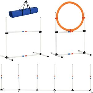 Teach your pet new tricks with PawHut's six-piece dog agility set! Your dog will love zipping through circles, leaping over high jumps and navigating obstacle courses, making playtime fun and keeping them fit. It includes two balls and a whistle to keep pets engaged, and a convenient bag for easy setup indoors or outdoors. Enjoy exciting play sessions that strengthen your bond with your dog. Specifications: ● Colour: Blue and orange ● Material: ABS, PE, Oxford cloth ● Ring: 92H x 135L x 66Wcm. Off the ground: 14-6cm ● Hurdle dimensions: 92H x 135L x 66Wccm. Off the ground: 10-82cm ● Weave poles: 69H x 348L x 66Wcm ● Pause box: 87L x 87Wcm ● Item label: D07-052V00OG Features: ● Six-piece set includes jumps, weave poles, a pause box and more ● Jump feature with a cloth wall, enhancing pet confidence when navigating obstacles ● Adjustable jump heights for different training levels ● Dog training whistle for training ● Including two balls to play fetch ● Comes with a bag for easy storage