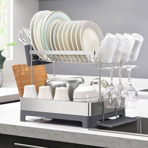 This 2 tier dish drainer rack is made of premium steel material with powder coated, effectively protecting itself from annoying rusting while offering great strength to hold more dishes and plates without deforming or discoloring during your daily use. The rack will look brand-new and durable even though for months use!Despite the plate holder, our dish drainer for kitchen counter also comes with a glass holder, a utensil holder, even a cutting board holder to meet your various needs for storing diverse kitchenware with effortless hanging. Equipped with an automatic drainage system, this dish drying rack includes central drainage holes and an effective swivel spout, making sure the water flows directly into the sink, not onto the countertop. Furthermore, the swivel spout is 360° rotatable so that you can adjust the placement of the dish rack more freely as per the location of the sink. Designed as a totally tool-free installation, easy to everyone. Just take out all components first, then assemble them with the help of the instruction manual. Ideal dish drainer which meet all your needs for storing and drying kitchenware. This will be a great choice for kitchen organize. Belfry Kitchen