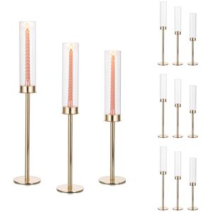 Glasseam Glass Tall Candle Holders for Taper Candles with Hurricane Sleeves 1.These clear circular candle holder is the perfect way to add a touch of elegance to your wedding table decorations. The sleek, clear design is perfect for any theme, and the hurricane shades help protect the flame, ensuring that your candles will stay lit all night long. 2.These Easter candle holder bulk are necessary for table display /table setting for candlelight dinners, Wedding receptions, Shabbat, Easter, Diwali, Kwanzaa and holiday decorations. 3.The thick and clear open cylindrical tube makes it easy to see the flames burning, and the sturdy metal base prevents candles from falling. Must have for al fresco dining. Specifications: Material: premium thickened glass and iron Color: Gold+Clear Size: Metal Candle Holder: Height: 9.84"/25 cm / 11.8"/30 cm / 13.8"/35 cm ...
