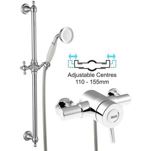 This Bristan Traditional Shower Valve has fully adjustable pipe centres - Adjustable Elbows Meaning this shower will replace showers with 110mm centres, 130mm centres, 138mm centres as well as the industry standard 150mm, and anything inbetween! Elbows can be adjusted for exposed pipework running up and down the wall at the wide range of centres mentioned above. Each Bristan Mini Valve comes with 2 sets of elbows allowing you to replace almost any shower mixer valve which has centres or 110mm or 155mm or anything inbetween. Choose the correct elbow configuration to suit your Inlet centres: 2 x small elbows 110-130 centres 2 x large elbows 136-155 1 small elbow / 1 large elbow 125-145 Suitable for both domestic and commercial installations Features Single sequential control for both temperature and flow Adjustable inlet centres mean you can use existing pipework with centres between 110mm and 155mm High performance even at 0.5 bar inlet pressure Automatic shutoff in the event of hot or