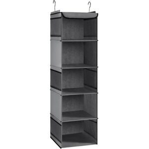Wardrobe organizer in fabric with 5 compartments and 6 pockets, each compartment is 30(L) X30(W) X21(H) cm. Really usefulness: As a Convenient wardrobe, you can put the collocations of you or your baby want to wear in next few days on each floor. As a hanging shoes rack: you can put your shoes or boots in it, easy to collect.The hanging shelves wardrobe made of high quality material Non Woven Fabric, very soft and skin-friendly; intermediate bottum is a Cardboard provides a sturdy and beautiful appearance; Solid Sew, so that it can support your clothes and accessories.Creates additional storage space, be convenient for sorting, With 5 compartments is Just can put matching clothes in each compartment for a week 5 working days, the hanging storage (108 x 30 x 30 cm) will make the best possible use of the storage space in the wardrobe. Ideal for stowing garments, towels, gloves, socks, etc. Rebrilliant