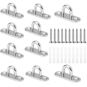 【High Quality Material】This M5 locking hook set is made of high quality 304 stainless steel, with high hardness, strong toughness, good performance, rust resistance and wear resistance, and long service life. 【Closed Hook】This M5 eye hook adopts a U-shaped closed design, which has a wider application range and can be fixed in all directions. It is the best choice for fixing anchor points and suspensions. 【Strong Load-Bearing Capacity】5mm thick hook, very strong and firm, can achieve a high load-bearing capacity after being well fixed, suitable for hanging heavy objects. 【Two-Hole Fixing】We provide an appropriate number of screws and white expansion tubes for easy installation; Our rectangular plate eye is designed with two holes, which can evenly distribute the force, have better load-bearing effect and not easy to fall off. 【Wide Application】This M5 eye hook is suitable for indoor and outdoor use, such as hanging decorations for chandeliers, ceiling fans, yoga equipment, etc., or